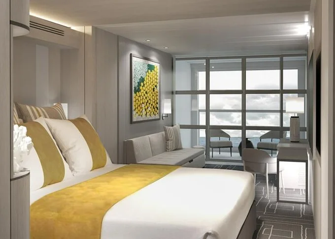 - Kajuty sú umiestnené v blízkosti lodného Spa. K ich vybaveniu patrí posilnený systém vzdušnej filtrácie, posteľ Queen-Size (v kategóriách Edge King-Size), veľké zasúvacie sklenené dvere, exkluzívne posteľné prádlo eXhale®, veľkorysé skladovacie priestory.